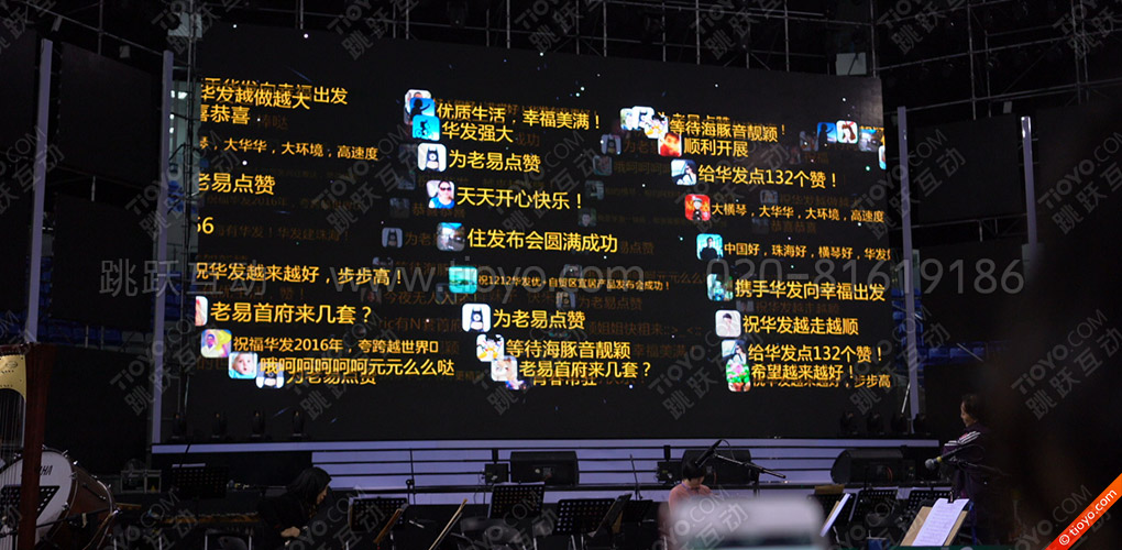 2015年12月12日,珠海横琴国际网球中心•华发中心球场座无虚席,华发优+自贸区高端作品发布会在此举行,海豚音公主张靓颖、中国三大男高音之一魏松和凤凰卫视著名支持人胡一虎倾力相会,助阵发布。会议开始前,大屏幕上由来宾微信头像组成“横琴节拍,震动世界”活动主题等3D图案,还不时有盛典祝福语“飞”上墙,使现场气氛空前热烈,跳跃互动十分荣幸不止一次为华发的活动现场带来欢呼与热烈。一位来宾表示:“这是真正让观众有参与感的时刻,看到自己的头像凝聚在活动主题和3D画面里,祝福语“飞入”大屏,还能下红包雨和财神爷!忍不住要多玩几次!”跳跃互动不止于签到的形式,更致力于不断完善产品,创造更具科技感的创新互动体验。